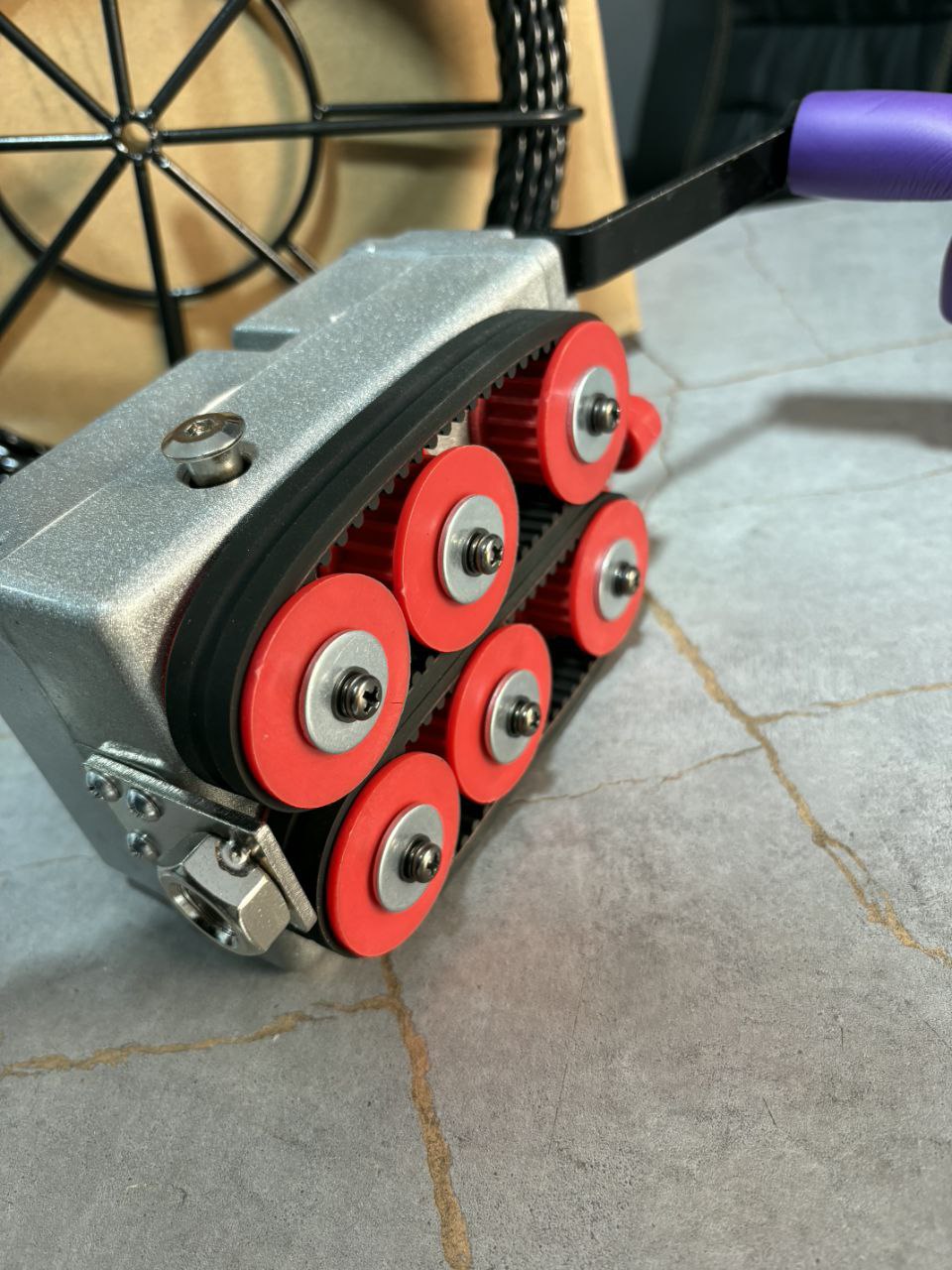 * آلية الدفع الثمانية: يحتوي المحول على نظام بكرات (تروس حمراء) متصلة بسيور مطاطية، تعمل على الإمساك بسلك السحب بقوة ودفعه أو سحبه بانتظام.