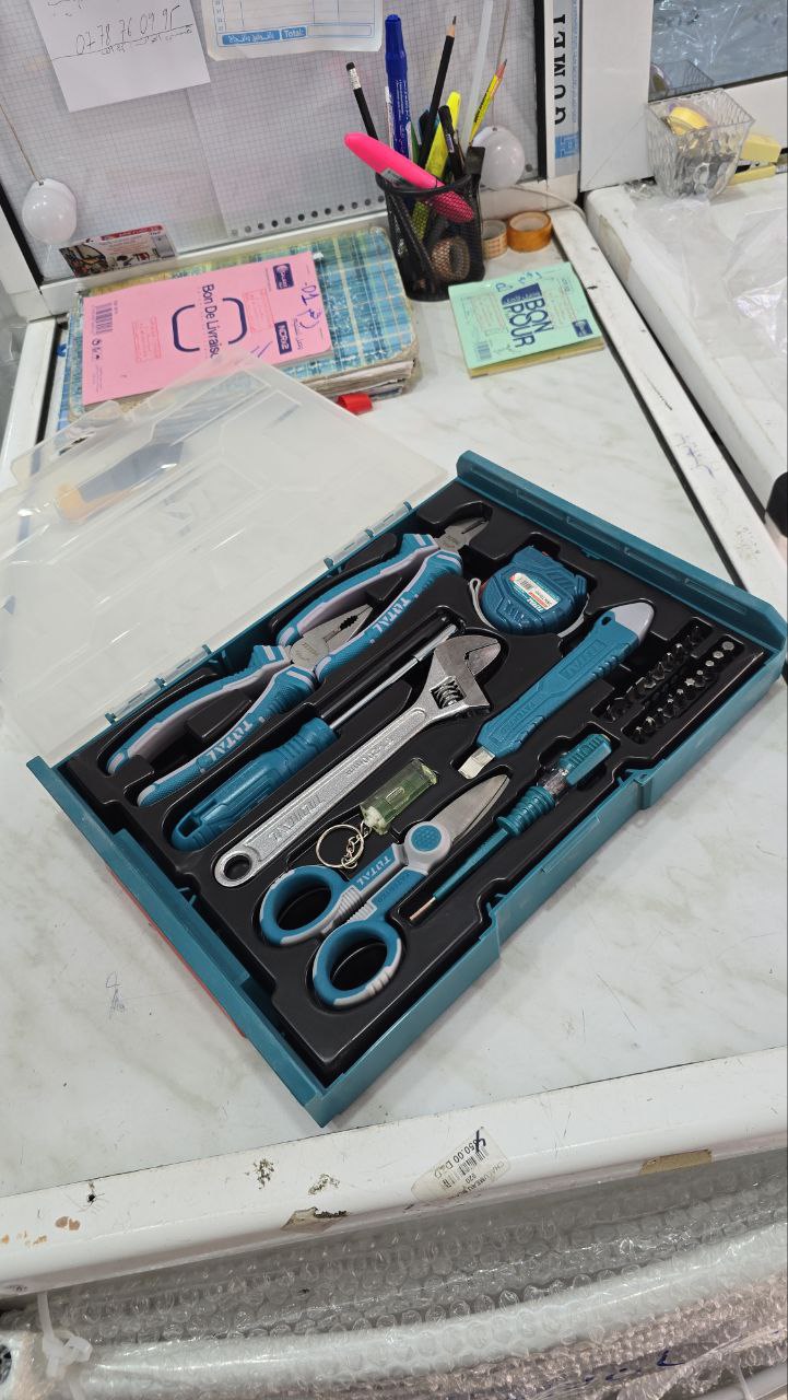 هذه علبة أدوات عملية ومتكاملة من العلامة التجارية « توتال » (TOTAL)، تحتوي على مجموعة متنوعة من 29 قطعة من الأدوات اليدوية الأساسية. تأتي الأدوات منظمة داخل علبة بلاستيكية متينة باللونين الأسود والأزرق الفيروزي، مع غطاء شفاف يسمح برؤية محتوياتها بسهولة. هذه المجموعة مثالية للاستخدام المنزلي، وأعمال الصيانة الخفيفة، والمشاريع اليدوية المختلفة.