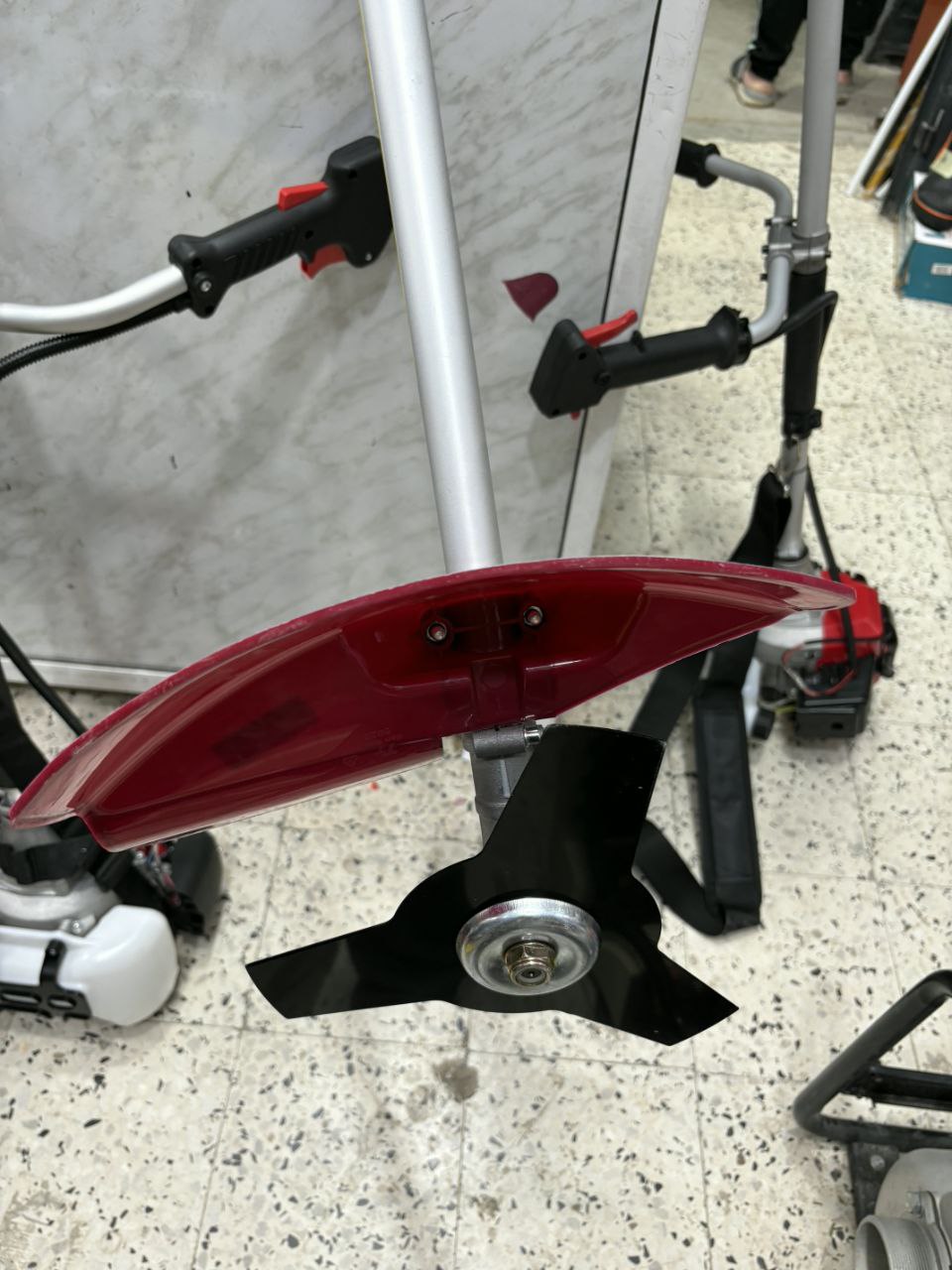 * رأس القطع: تظهر الصور تزويدها بأسطوانة دائرية مسننة (Saw Blade) مثالية لقطع الأغصان السميكة والشجيرات.