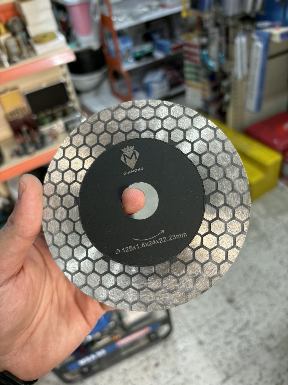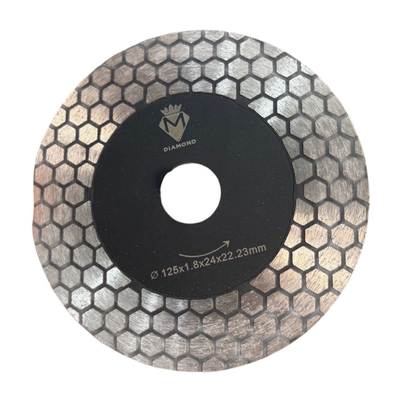 يتميز هذا الديسك من علامة Mohamed Diamond بتصميم مبتكر يعتمد على نمط الألماس الموزع بشكل سداسي (Honeycomb design) على كلا الوجهين. هذا التصميم ليس جمالياً فحسب، بل يوفر كفاءة استثنائية في تبريد الشفرة وسرعة التخلص من الغبار أثناء العمل، مما يجعله مثالياً للمهمات الصعبة.
