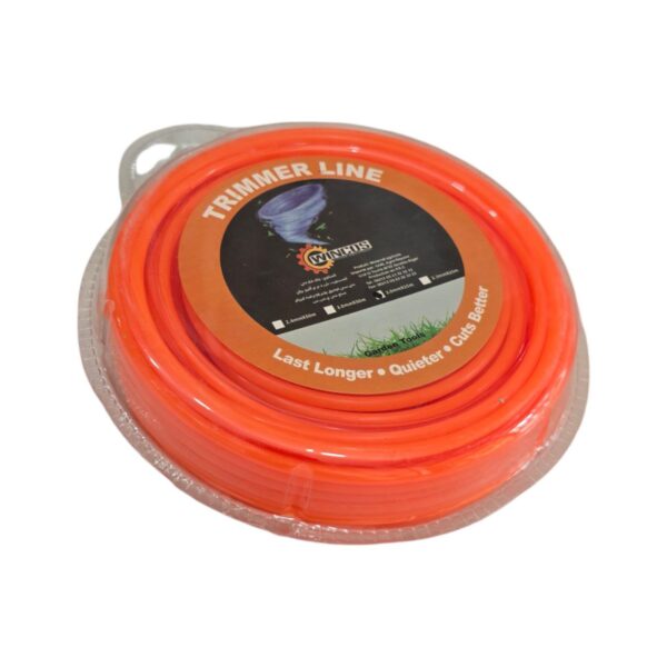 يُظهر المنتج في الصورة بكرة برتقالية اللون من خيط جزازة (Trimmer Line) مغلفة بغطاء بلاستيكي شفاف. يقع ملصق دائري في المنتصف يحمل العلامة التجارية « WINHUS » وشعارًا على شكل دوامة.
