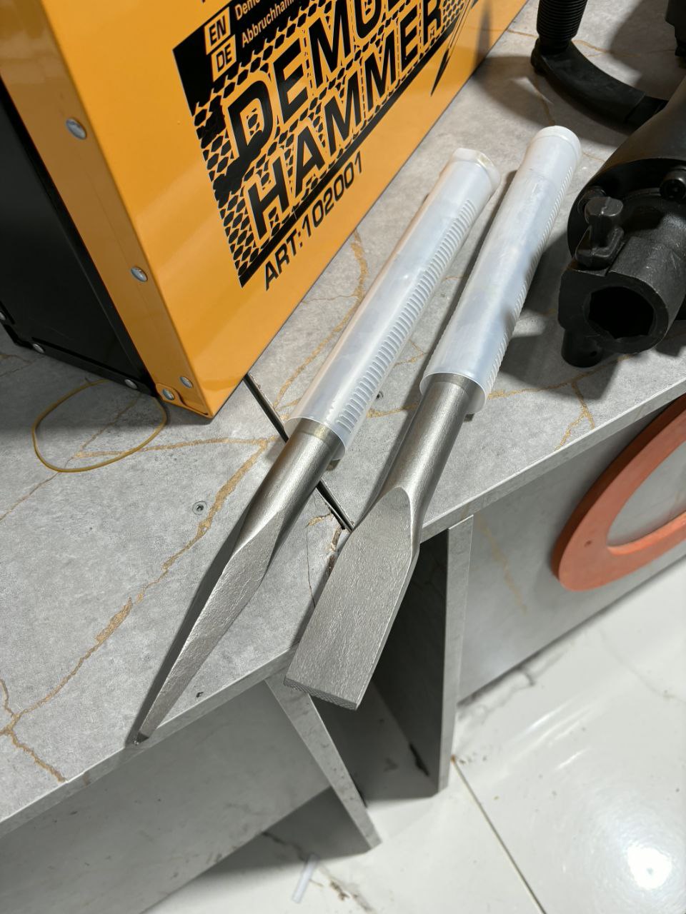 * الملحقات: يأتي مع حقيبة معدنية متينة للحماية، بالإضافة إلى رؤوس تكسير (إزميل مدبب وإزميل مسطح).