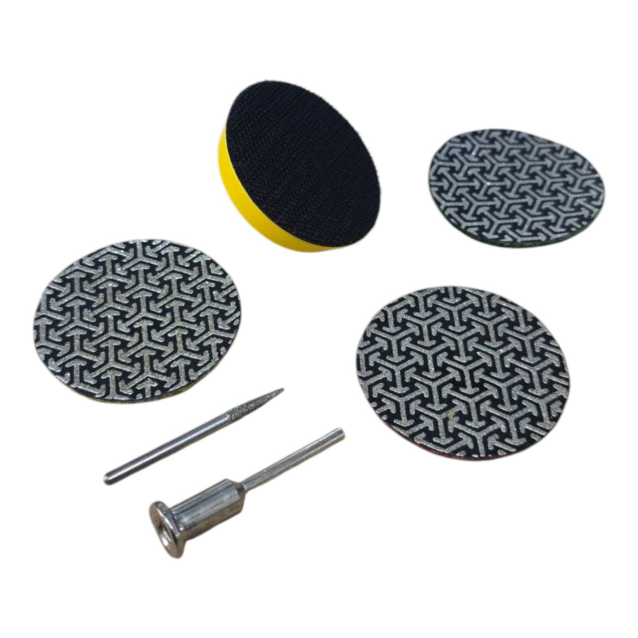 ثلاثة أقراص ماسية: تتميز هذه الأقراص بلونها الأسود والرمادي، ونقشتها الهندسية المتشابكة التي تحتوي على جزيئات ماسية دقيقة. هذه الأقراص مصممة لتلميع الأسطح مثل الحجر، الرخام، الزجاج، أو الخزف. تأتي المجموعة بثلاث درجات خشونة مختلفة: 50، 100، و200، مما يتيح لك الانتقال من الصقل الخشن إلى التنعيم.