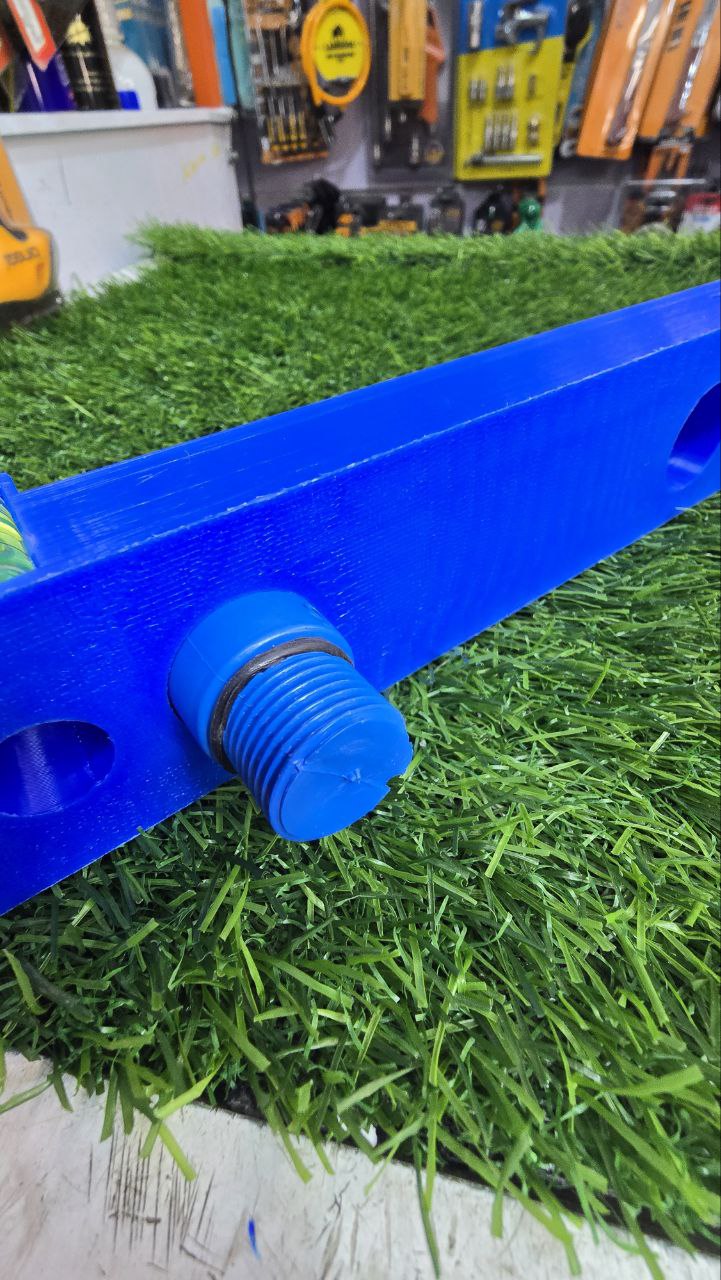 ميزان ماء احترافي مصنوع من مادة متينة باللون الأزرق، مصمم لضمان الدقة في عمليات الاستواء. يتميز بمستويين فقاعيين مدمجين لقياس الزوايا الأفقية والرأسية، مما يجعله مثاليًا للاستخدام في الأعمال الإنشائية والميكانيكية. يحتوي الميزان على ثقوب دائرية تقلل الوزن وتوفر إمكانية التثبيت أو التعليق. كما أنه مزود بموصلات ملولبة في كلا الطرفين، مما يشير إلى إمكانية توصيله بأدوات أخرى لتعزيز وظائفه.