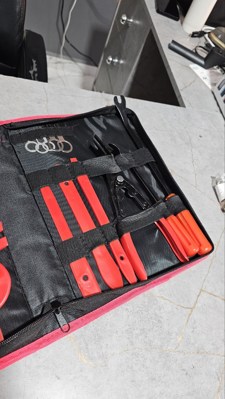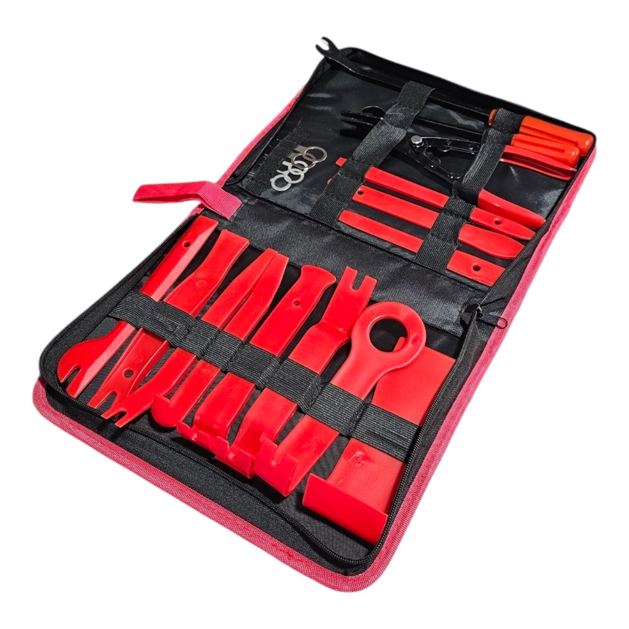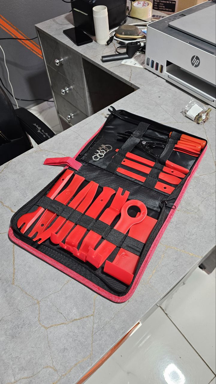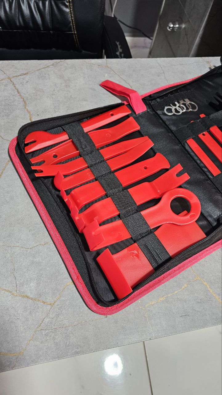 ​أدوات فك بلاستيكية (مختلفة الأشكال): مصممة بزويا وانحناءات متنوعة لتناسب فك أجزاء الطبلون، بطانات الأبواب، ومقابض السقف دون خدش الأسطح الحساسة أو إتلاف الجلد والبلاستيك.