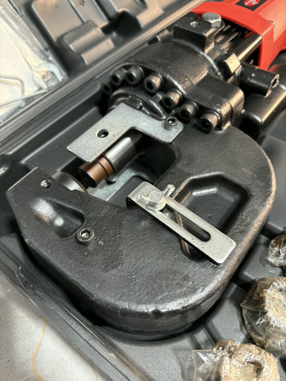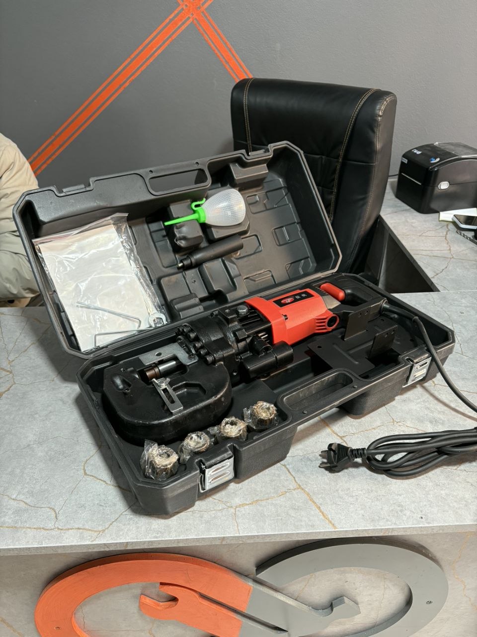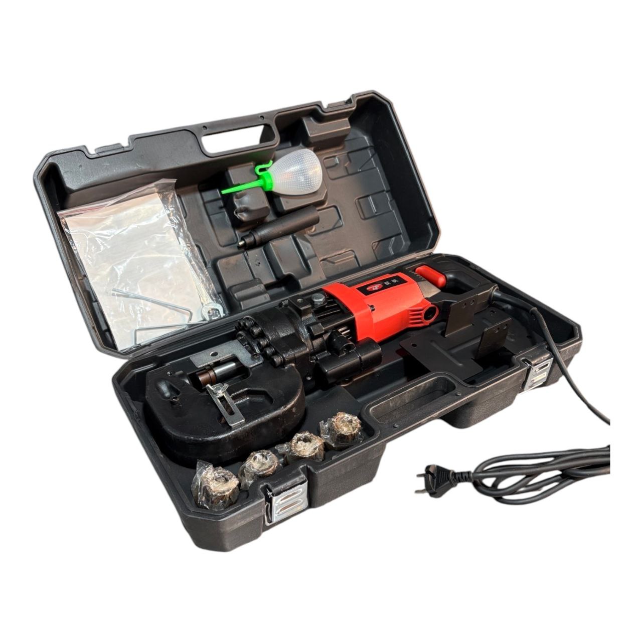 هذا الجهاز هو أداة محمولة عالية الأداء تستخدم الضغط الهيدروليكي المولد كهربائياً لعمل ثقوب دقيقة ومثالية في الصفائح المعدنية والكمرات الحديدية (U-steel / L-steel). تعتبر البديل الأسرع والأكثر نظافة للمثقاب الكهربائي العادي، حيث لا تخلف رايشاً معدنياً أو شرارات.
