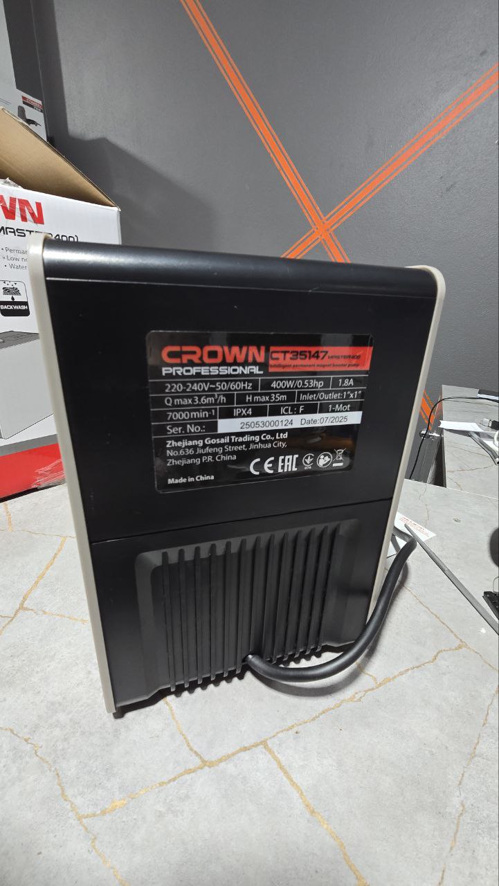 تعتبر مضخة Crown CT35147 مضخة مياه ذكية وصغيرة الحجم، مصممة خصيصاً لزيادة ضغط المياه في المنازل والشقق. ما يميز هذا الموديل هو « الذكاء الاصطناعي » المدمج الذي يتحكم في التشغيل والإيقاف تلقائياً بناءً على تدفق المياه، مما يلغي الحاجة لتركيب « سيرفو » (Servo) خارجي أو خزان ضغط.