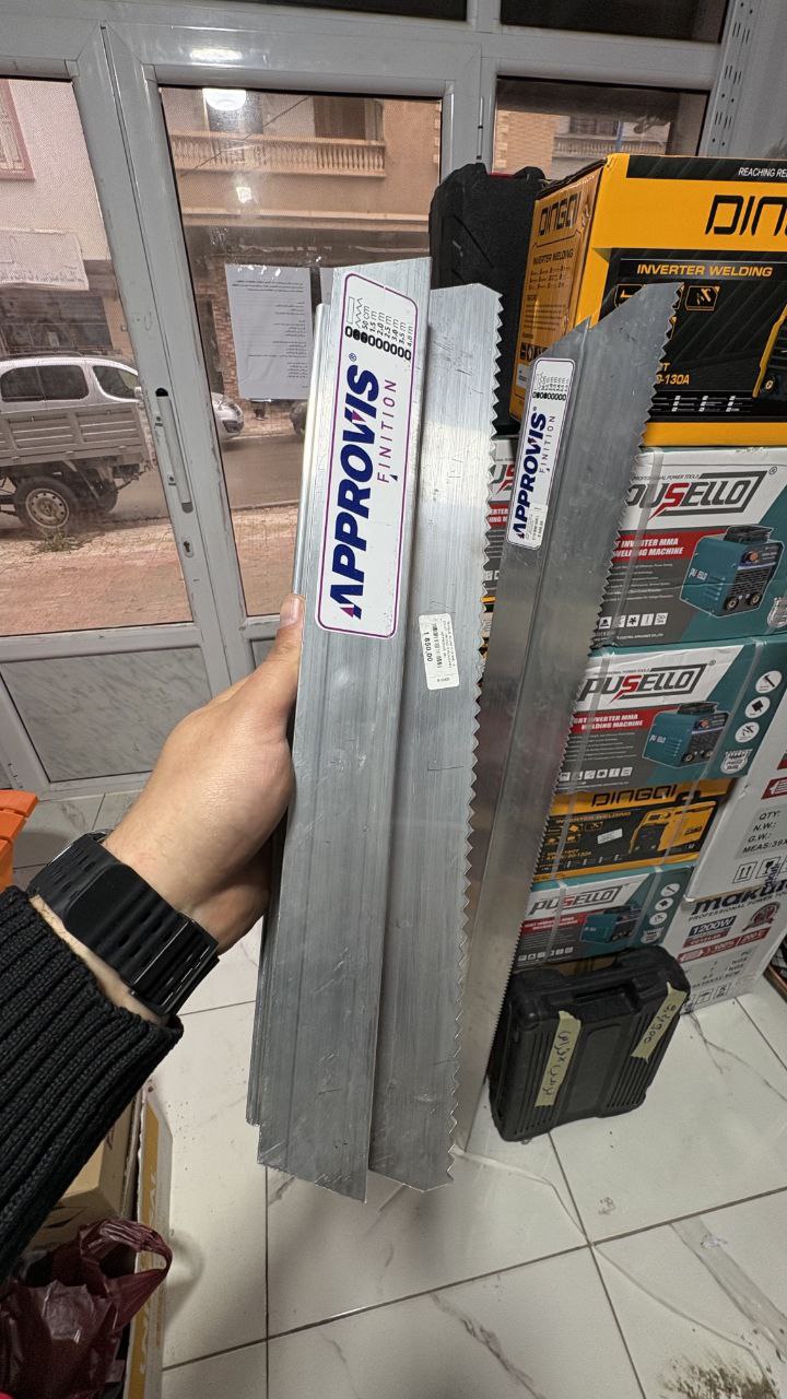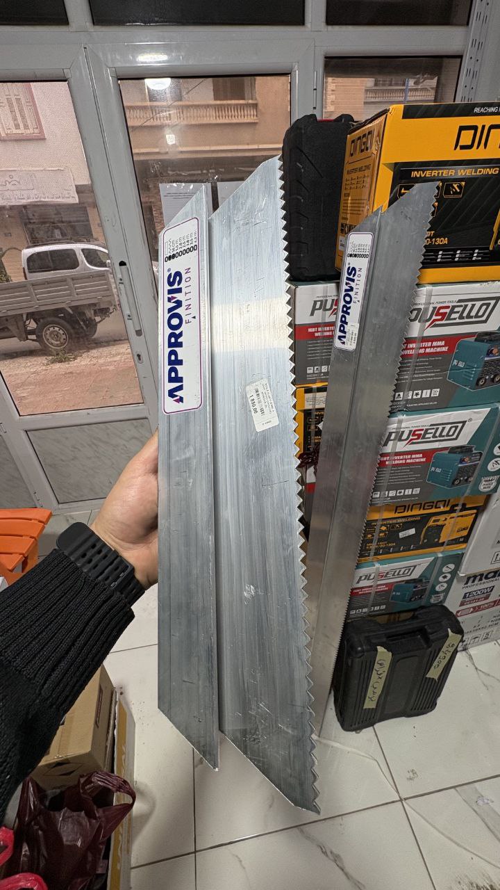 تُعد المسطرة المسننة (Règle à dents) أداة حيوية واحترافية لا غنى عنها لعمال السيراميك والرخام، حيث تضمن توزيعاً متساوياً ومثالياً للمادة اللاصقة (السيما كول) على المساحات الكبيرة.