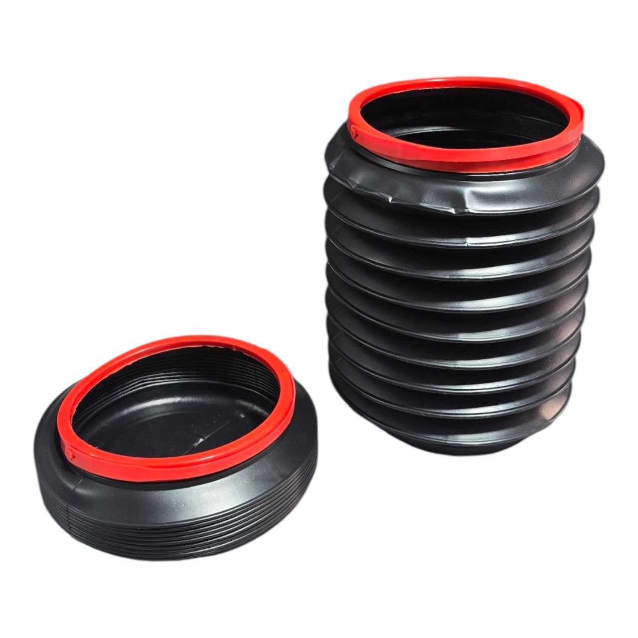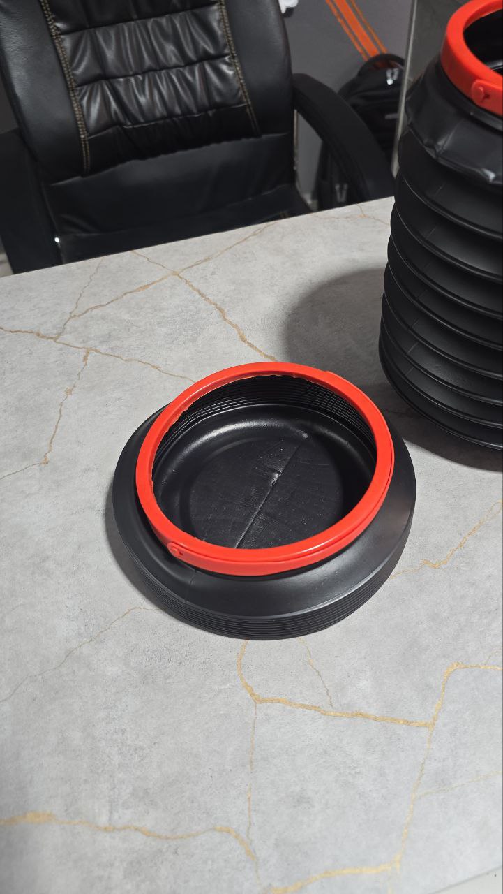 تتكون السلة من مادة بلاستيكية متينة ومرنة (عادةً البولي بروبيلين أو المطاط الصناعي) باللون الأسود، مع حلقة حمراء عند الفتحة العلوية لتعزيز الهيكل وتسهيل الفتح والإغلاق. هذا التصميم يجعله حلًا مثاليًا للحفاظ على نظافة السيارة دون أن يشغل مساحة كبيرة.